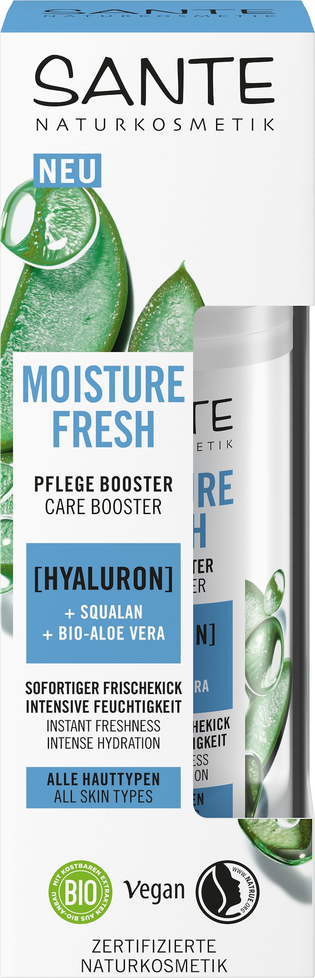 Booster pielęgnacyjny to natychmiastowy zastrzyk świeżości dla skóry. Dzień po dniu Booster intensywnie nawilża i wypełnia skórę wilgocią od wewnątrz, zapewniając długotrwały, promienny i delikatnie pielęgnowany efekt. Kwas hialuronowy ma dużą zdolność do zatrzymania wody, co sprawia, że skóra staje się jędrniejsza od wewnątrz. Skwalan znany jest ze swoich właściwości nawilżający i ochronnych. Zapewnia intensywną pielęgnację i pozostawia skórę miękka w dotyku. Bio Aloes-Vera intensywnie nawilża i zachowuje naturalną równowagę.