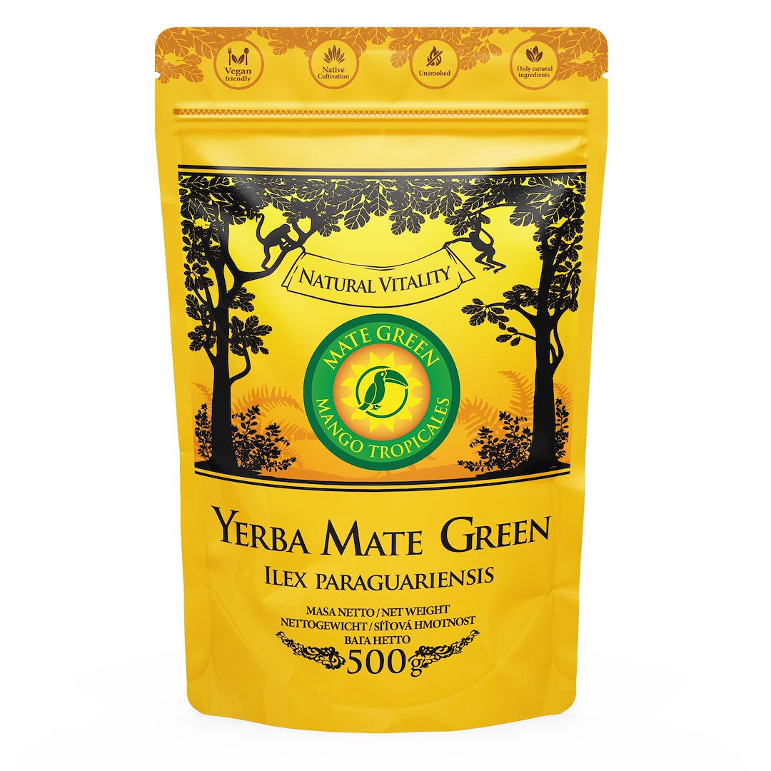 Brazylijska Yerba Mate Green jest szlachetną odmianą ostrokrzewu paragwajskiego. Smak tej mate jest delikatny, wynikający z harmonijnego połączenia ostrokrzewu oraz owoców. Lekko owocowy aromat pozostaje przy wielokrotnym dolewaniu wody do tej samej porcji suszu. Owocowe składniki nadają tej kompozycji dobrze wyczuwalny aromat i smak, w którym gorzka nuta jest zbilansowana tak, że powstaje napar dość mocny, jednak nie gorzki. Zdecydowany smak ostrokrzewu koresponduje tu ze słodyczą owoców mango i ananasa. Nuty owocowe są mocniejsze w kolejnych zalaniach. Mate Green to bestseller, najlepsza yerba mate z rodzinnej plantacji w brazylijskim tropiku. Oznacza się dużą zawartością naturalnej kofeiny i naturalnym roślinnym smakiem, duże kawałki owoców mango bez sztucznego cukru, zachwycające połączeniem słodyczy w smaku i zapachu dodający egzotycznego charakteru bez dodatku sacharozy.